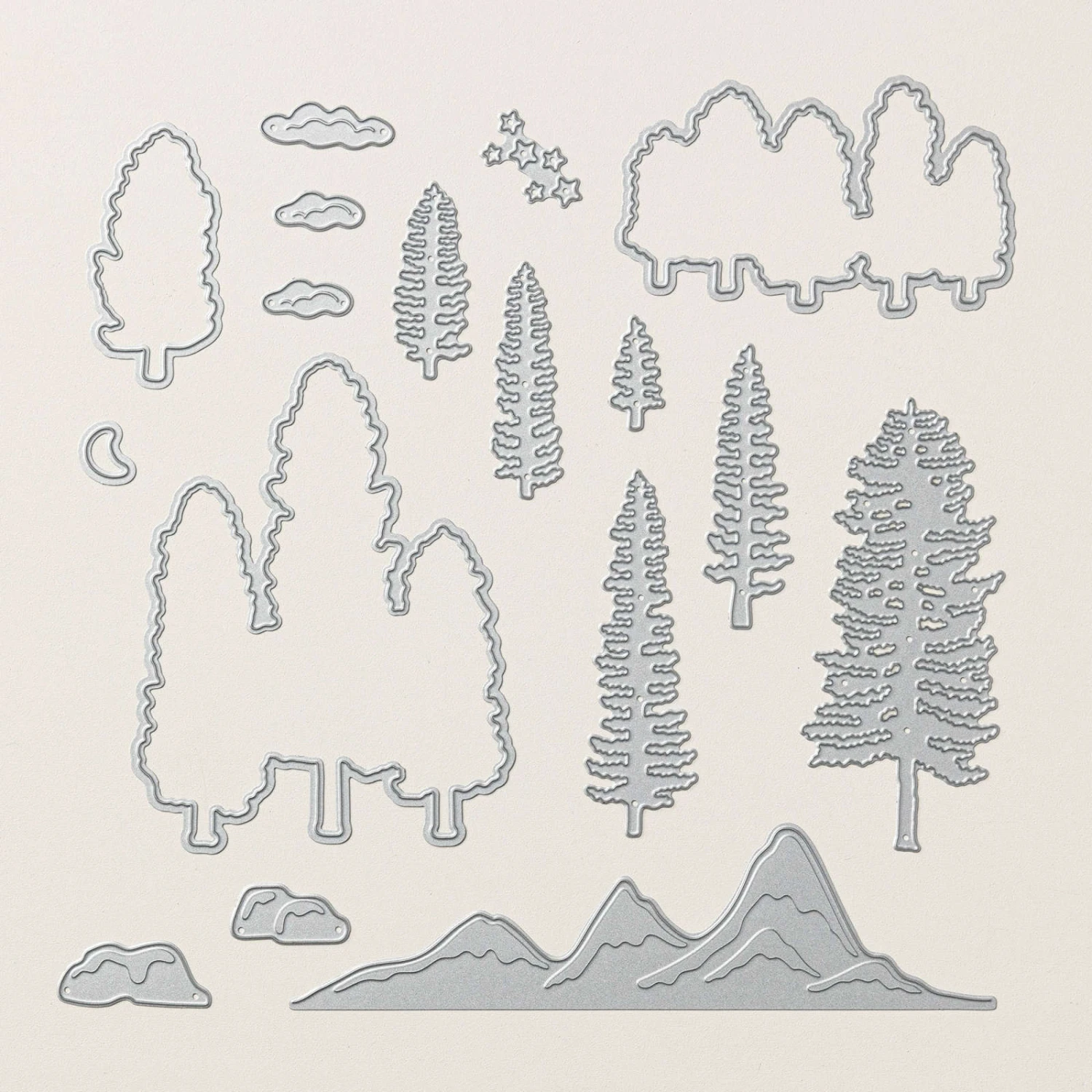 Wer die Natur liebt, wird auch diese Stanzformen schnell ins kreative Herz schließen! Kein Wunder, denn die Stanzmotive beinhalten Bäume, Elemente zum Gestalten des Himmels, Felsen und Berge. Damit kreieren Sie Papierprojekte, die so ewig und zeitlos sind wie die Natur selbst. Ob winterliche Weihnachtskarten, Grüße für Outdoor-Fans oder etwas anderes: Die Nadelbaum-Stanzformen und das Gebirgsmotiv lassen sich wunderbar mehrlagig arrangieren, sodass im Nu eine eindrucksvolle Landschaftsszene mit einem ausgedehnten Wald entsteht. Wenn Sie dann noch einen hübschen Halbmond und ein paar Sterne ausstanzen, ist auch der zauberhafte Nachthimmel für Ihr Projekt perfekt!